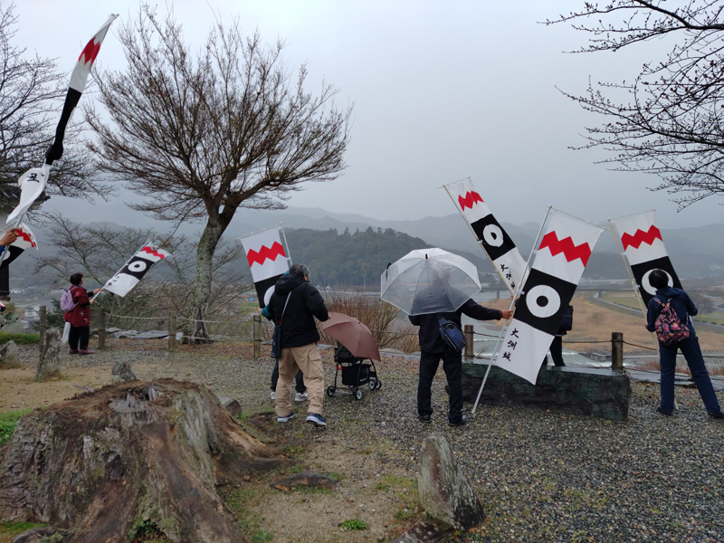 朝から曇り空で次第に雨が降り始めました。雨の中での旗振りになりましたが、多くの方に参加していただきました。八幡浜編では地元大洲市の方々や香川県からのご夫婦、大分県からのご家族、静岡県からの男性などの方々が参加され、11名での旗振りになりました。大分県からの方々は雨の中の旗振りになりましたが、貴重な体験ができたので良かったですとのことでした。道後編でも、雨の中の旗振りになりましたが、団体の方々が参加され、20名での旗振りになりました。旗振りへのご参加、ありがとうございました。