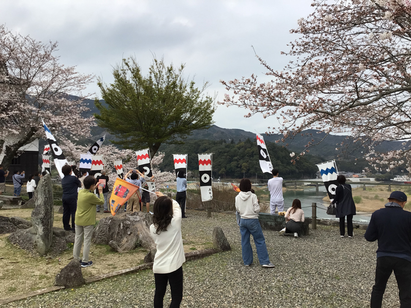 天気は薄曇りですが、気温は暖かくお花見日和です。八幡浜編では地元大洲や愛媛県内の方、東京都からのご家族の方々などに参加していただき、20名での旗振りになりました。道後編では団体のお客様などが参加され、同じく20名での旗振りになりました。桜の花もたくさんついたので、集合写真も桜を入れての撮影です。旗振りへのご参加、ありがとうございました。
