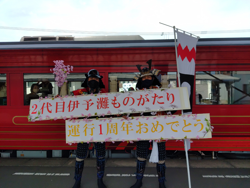 この日、伊予灘ものがたり2代目車両が運行1周年を迎えました。八幡浜編にはJR四国のイメージキャラクター、すまいるえきちゃんが旗振りに参加して、一緒にお祝いの旗振りをしました。また、午前の大洲編では大洲駅へお祝いのボードを持ってお出迎えに参加しました。