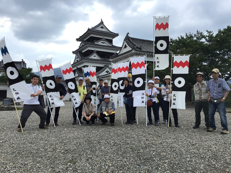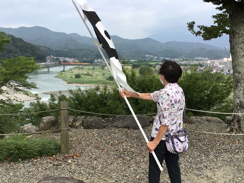 7月になりましたが、梅雨明けはまだまだ先のようで空模様も雲が多いです。八幡浜編ではこの時間の前後に入られた団体の方々に参加していただき、15名での旗振りになりました。集合写真もお城を背景に撮影です。道後編では千葉県からのお二人と地元の方に参加していただきました。雨が降りそうな天気でしたが、旗振りの間は天気が持ってくれてよかったです。旗振りへのご参加ありがとうございました。