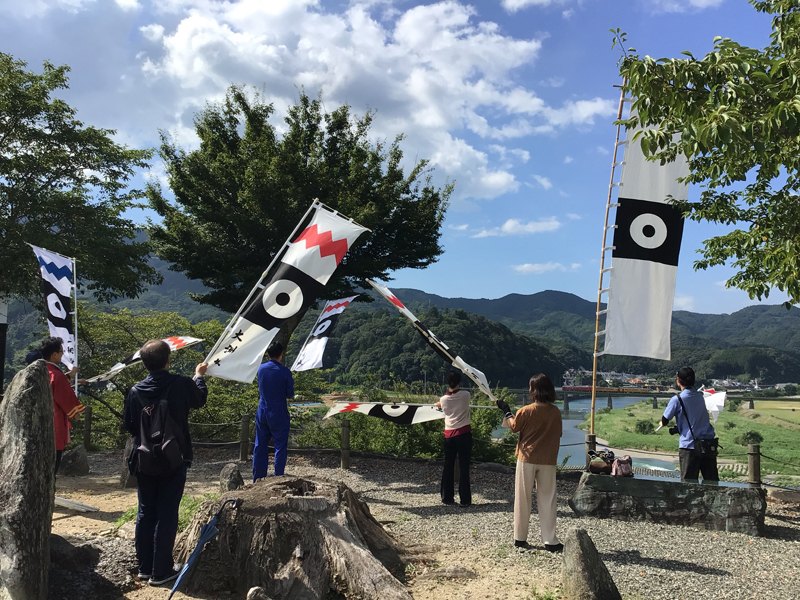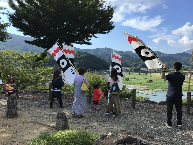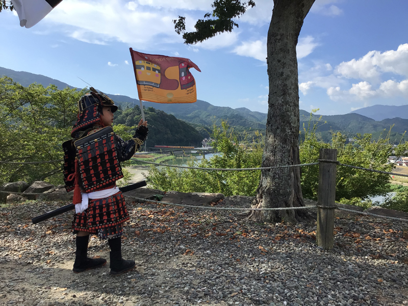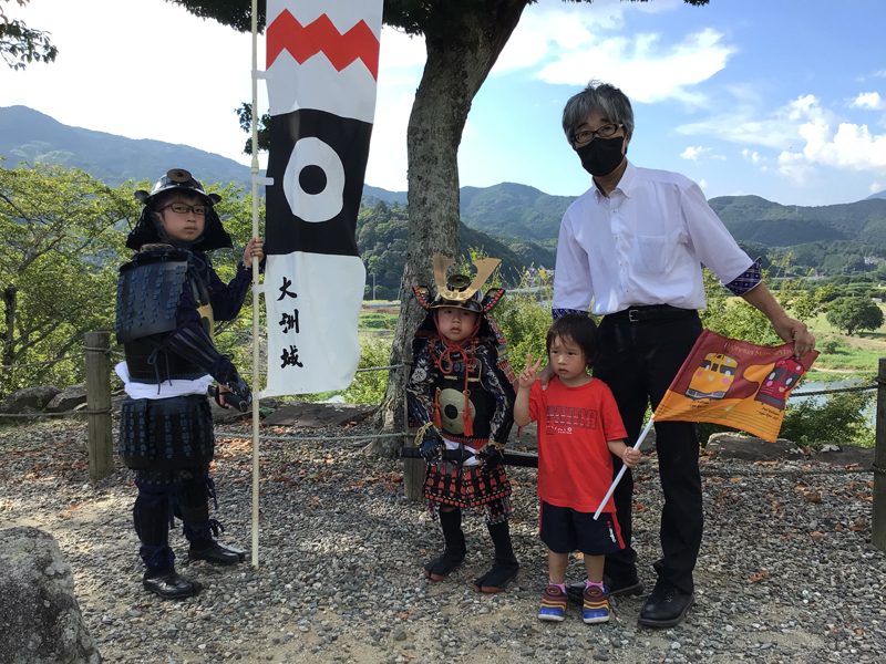 梅雨が明けてからは、連日暑い日が続いております。伊予灘ものがたりが7月26日に運行して9周年を迎えたので、大洲城ではのぼり旗を城山に立ててお祝いしました。伊予灘ものがたりが運行を始めてからもう9年になりますが、大洲城での歓迎旗振りもおかげさまで9年続けることができました。これからも伊予灘ものがたりが走る限り、歓迎旗振りを実施いたします。八幡浜編では地元大洲市の男性や、福岡県からの男性などの方々に参加していただき9名での旗振りになりました。福岡県からの男性は午前中は伊予灘ものがたりに乗車され、午後は9周年を迎えた列車を追いかけて大洲城に来られたとのことでした。道後編ではこの日武将なりきりで甲冑体験をした神川県からのご家族に参加していただき、8名での旗振りになりました。男の子3人兄弟で、お兄ちゃん2人が甲冑姿で旗を振ってくれました。旗振りへのご参加、ありがとうございました。