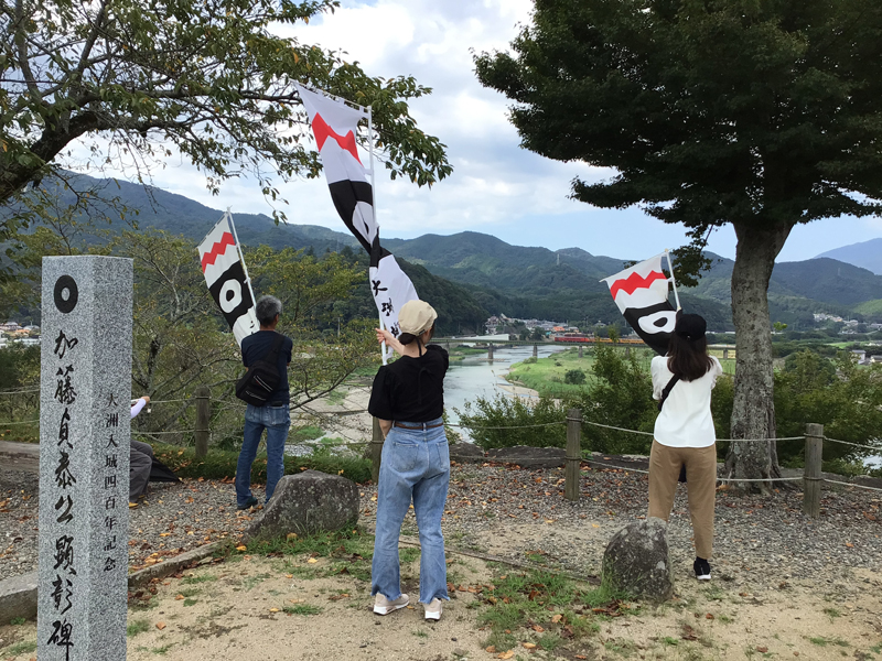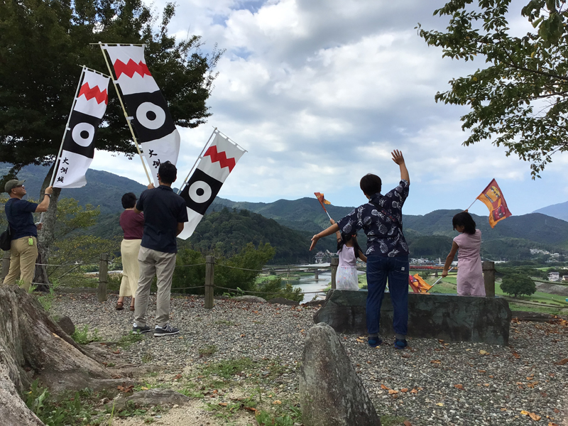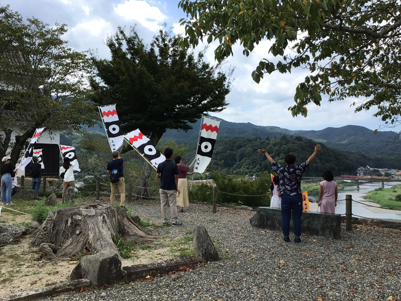 天気は時々晴れ間が見えるくらいの曇り空で、蒸し暑い一日でした。八幡浜編ではいつも旗振りに来てくれる姉妹とお母さん、東京都からの女性3名と、北海道からのご夫婦などの方々に参加していただき、11名での旗振りになりました。旗振りに来てくれたお姉ちゃんと妹の二人は小さい旗を2本持って、手旗信号で「いってらっしゃい」「ありがとう」などメッセージを列車に向かって送りました。列車からは見えたでしょうか。北海道からのご夫婦は伊予灘ものがたりの午前の便で大洲へ来られて、大洲の町を観光されたとのことでした。道後編では千葉県からの女性などの方々に参加していただき、3名での旗振りでした。千葉県からの女性は列車に乗るよりも貴重な体験ができたとのことでした。旗振りへのご参加、ありがとうございました。
